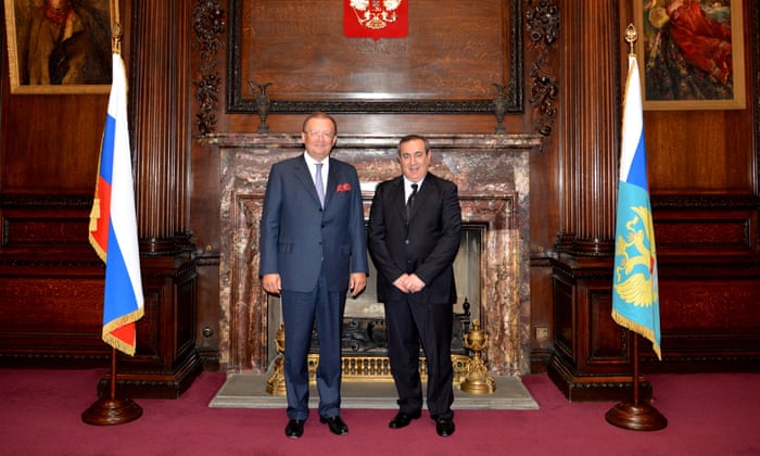 | Joseph Mifsud, right, with Alexander Yakovenko, the Russian ambassador to the UK, in a photo from 2014. The pair apparently discussed an academic summit in Moscow that Mifsud had attended. Photograph: Russian embassy |