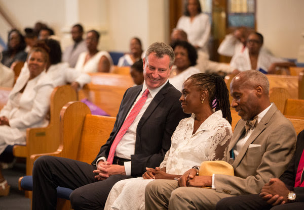 Bill de Blasio, left, at Memorial Baptist Church in Harlem with his wife, Chirlane McCray, and State Senator Bill Perkins